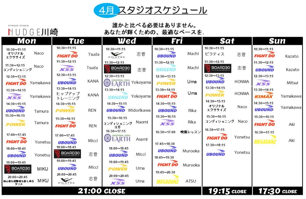 【2026年4月スケジュール】 投稿日: 2026.03.18 投稿者: nudge staff いつもFITNESS STUDIO NUDGE川崎店をご愛顧いただき誠にありがとうございます。 2026年4月のスケジュールをご案内いたします。